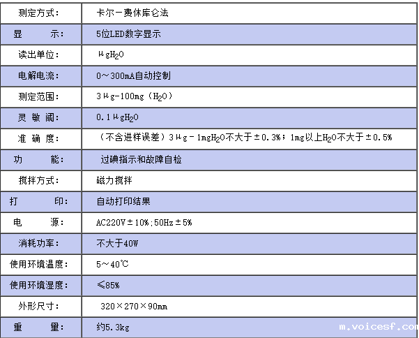 仪器符合GB/T7600;SH/T0246;GB/T606及采用卡尔—费休法测定样品中水分的有关标准,仪器采用了先进的自动控制电路,电解电流自动跟踪控制,外型结构新颖,从而使该仪器工作更可靠,使用更方便,具有分析速度快(一分钟出结果)、操作简便、精度高、自动性强等特点,同时具有自动打印功能,可将实验结果、做样时间、样品编号自动打印出来,广泛应用于石油、化工、电力、铁路、环保等部门。
