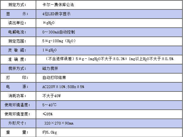 仪器符合GB/T7600;SH/T0246;GB/T606及采用卡尔—费休法测定样品中水分的有关标准。仪器采用了先进的自动控制电路,电解电流自动跟踪控制,外型结构新颖,从而使该仪器工作更可靠, 使用更方便,具有分析速度快(一分钟出结果)、操作简便、精度高、自动性强等特点, 同时具有自动打印功能,可将实验结果、做样时间、样品编号自动打印出来, 广泛应用于石油、化工、电力、铁路、环保等部门。